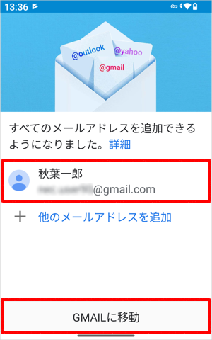 画面に表示されているGoogleアカウントのGmailを使用する場合は、「GMAILに移動」をタップします。