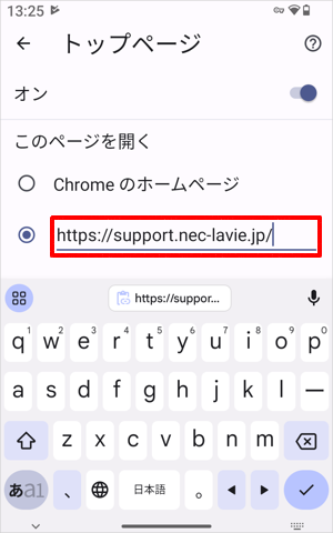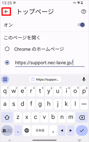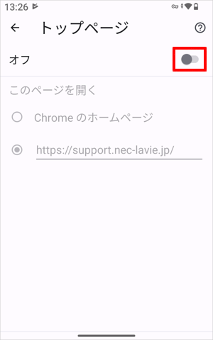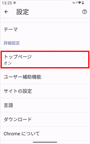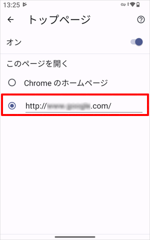 上記画面で「Chromeのホームページ」をタップすると、「新しいタブ」がトップページとして設定されます。