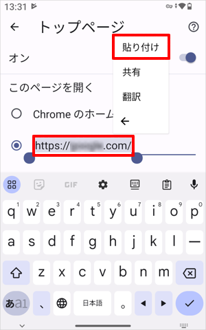 9. 現在設定されているトップページのURLを長押しして、表示された一覧から「貼り付け」をタップします。