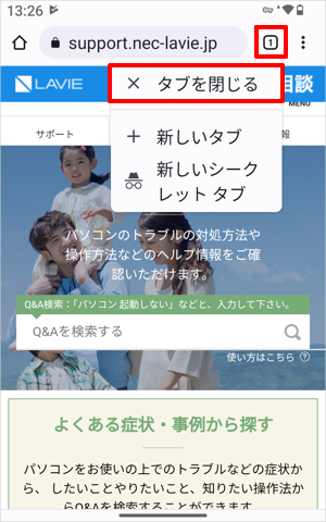 12. 」を長押しし、「タブを閉じる」をタップしてChromeを閉じます。