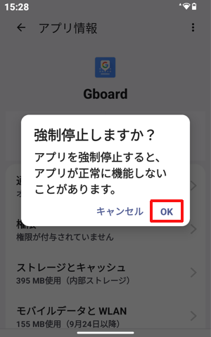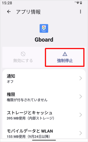 「Gboard」を強制停止した後に再起動させることで、現象が改善するか確認してください。