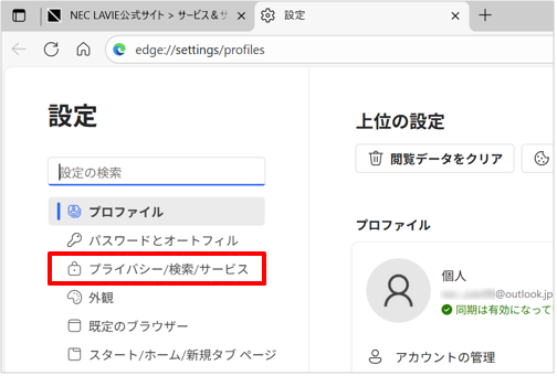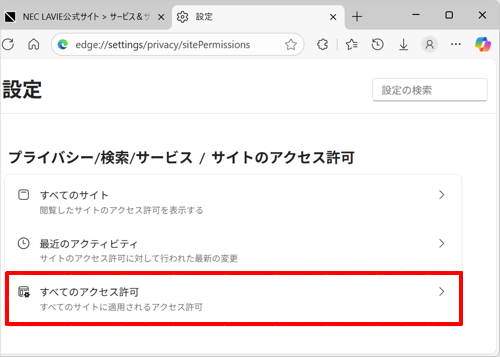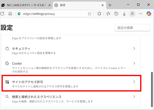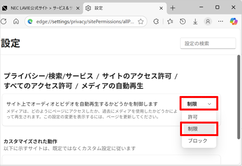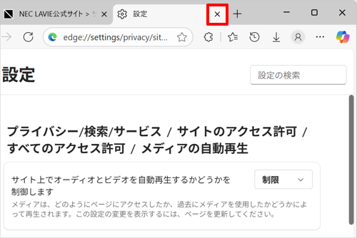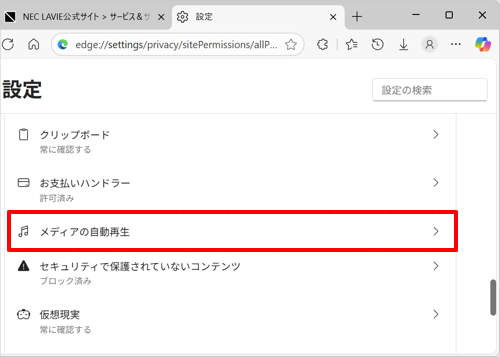 Q&A検索 製品 LAVIE Windows 11のMicrosoft Edgeで動画や音楽などが自動的に再生されてしまう場合の対処方法