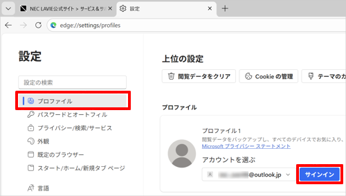 画面左側から「プロファイル」をクリックし、「サインイン」をクリックします。