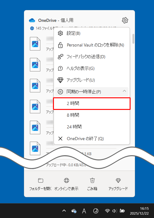 「従量制課金接続を使用している」、「同期によりパソコンの動作が遅い」などの理由から同期したくない場合、一時的に同期を停止することができます。