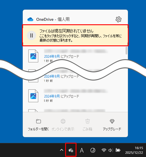 タスクバーの通知領域から「OneDrive」(OneDrive)をクリックし、表示された一覧から「ファイルは現在同期されていません」をクリックすると、同期が再開します。