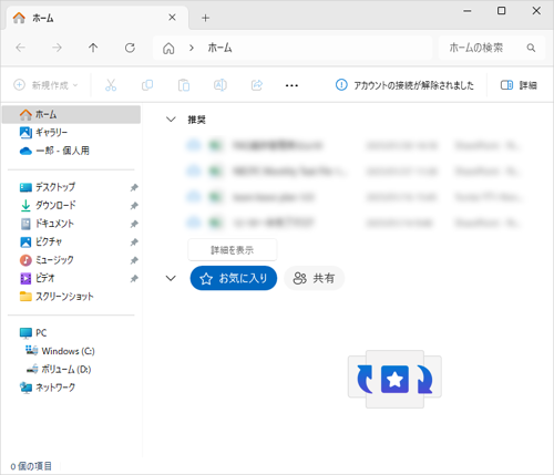 ホームでは、「推奨」や「お気に入り」欄に、頻繁に使用するフォルダーやファイルが自動で追加されます。