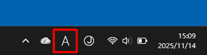 Microsoft IMEアイコンが「A」と表示されている場合は「半角英数字入力モード」、「あ」と表示されている場合は「日本語入力モード」です。