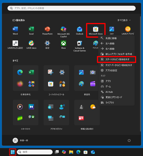 ここでは例として、「Microsoft Store」のピン留めを解除します。