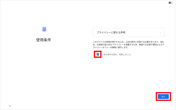 「上記の条件を読み、同意しました。」の前にあるチェックボックスにチェックを入れて、「次へ」をタップします。