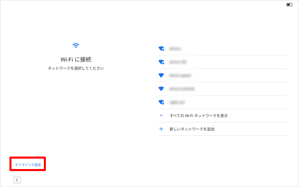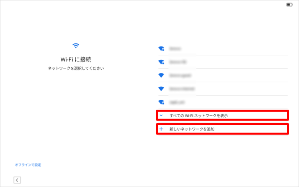 周囲のワイヤレスネットワークが自動で検出されるので、接続したいネットワークをタップするか、「オフラインで設定」をタップします。