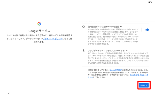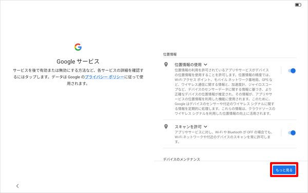 初期設定後にワイヤレスネットワーク(無線LAN)の接続やGoogleアカウントの登録を行う場合は、以下の情報を参照してください。