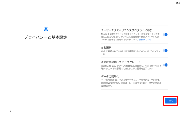 「プライバシーと基本設定」が表示されたら、「次へ」をタップします。