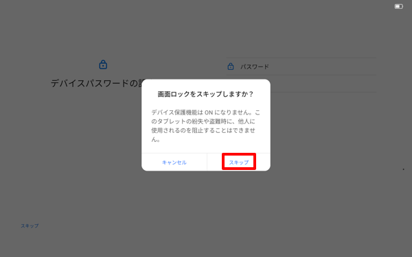 「画面ロックをスキップしますか?」が表示されたら、「スキップ」をタップします。