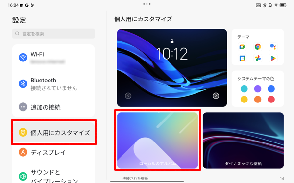 画面左側から「個人用にカスタマイズ」をタップし、表示された一覧から「ローカルのアルバム」をタップします。