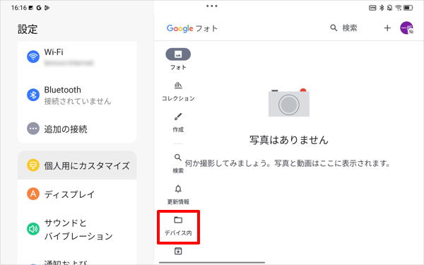 ここでは例として、「デバイス内」のフォルダーをタップします。