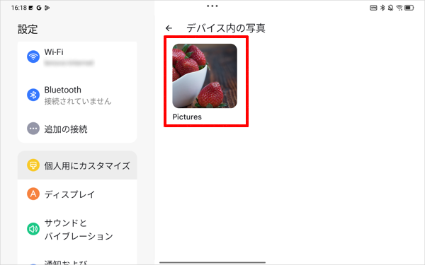 「デバイス内の写真」が表示されたら、「Pictures」フォルダーをタップします。