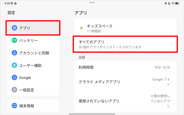 画面左側から「アプリ」をタップし、表示された一覧から「すべてのアプリ」をタップします。
