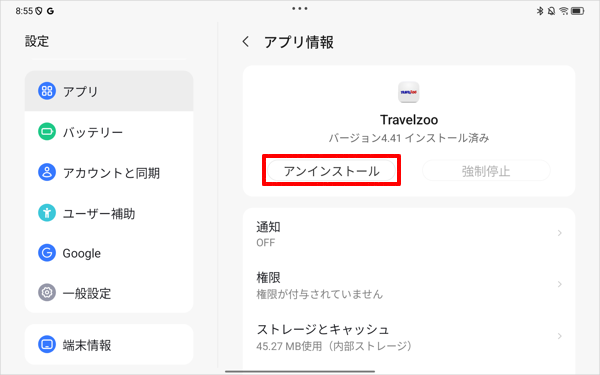 4. 「アプリ情報」が表示されたら、「アンインストール」をタップします。