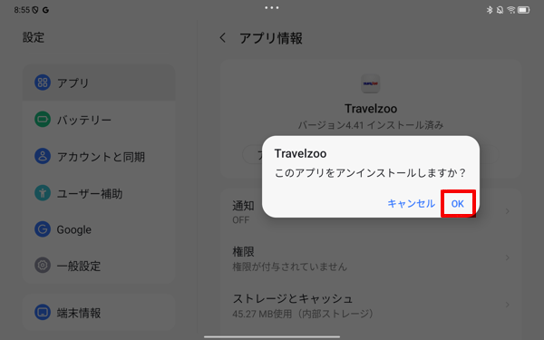 5. 「このアプリをアンインストールしますか?」が表示されたら、「OK」をタップします。