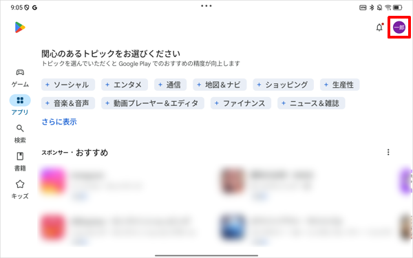 3. 「Playストア」が起動したら、画面右上の「」(ユーザーアカウント)をタップします。