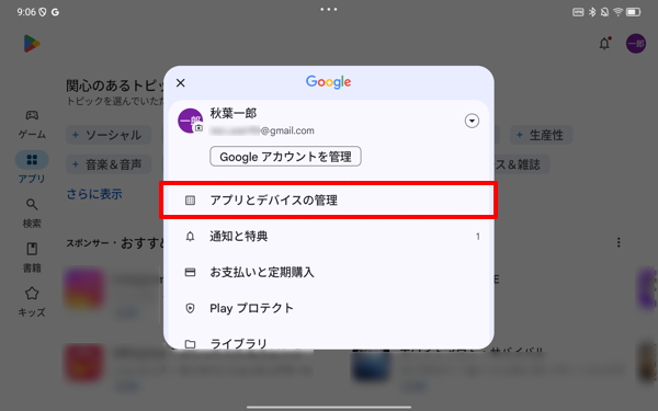 4. 表示された一覧から、「アプリとデバイスの管理」をタップします。