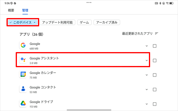 6. 「このデバイス」をタップし、表示された一覧からアンインストールしたいアプリをタップします。