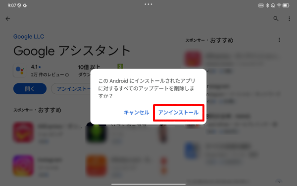 8. 「このAndroidにインストールされたアプリに対するすべてのアップデートを削除しますか?」が表示されたら、「アンインストール」をタップします。