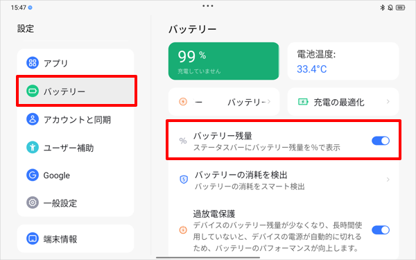 画面左側から「バッテリー」をタップし、「バッテリー残量」をタップして、スイッチを「オン」にします。
