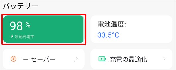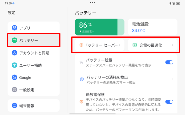 「バッテリーセーバー」と「充電の最適化」を確認できます。