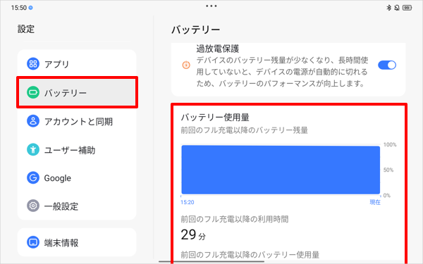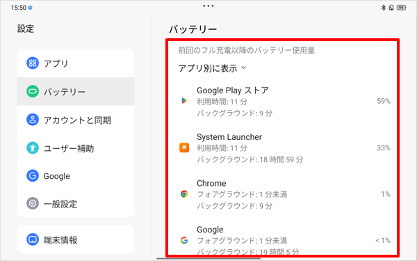 また、設定の「バッテリー」画面では、バッテリの使用状況の履歴や詳細を確認することができます。 タブレットの電力消費が激しい場合には、「バッテリー使用量」画面でバッテリの使用量のグラフや、使用量の内訳を確認できます。