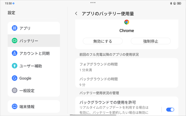 「前回のフル充電以降のバッテリー使用量」欄に表示されているアプリの項目をタップすると、バッテリ使用状況の詳細を確認したり、バックグラウンドでの実行を設定したりできます。
