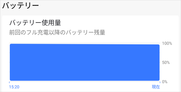設定から「バッテリー」画面を表示し、バッテリ使用量の履歴をグラフで確認したり、使用状況の詳細を確認したりできます。