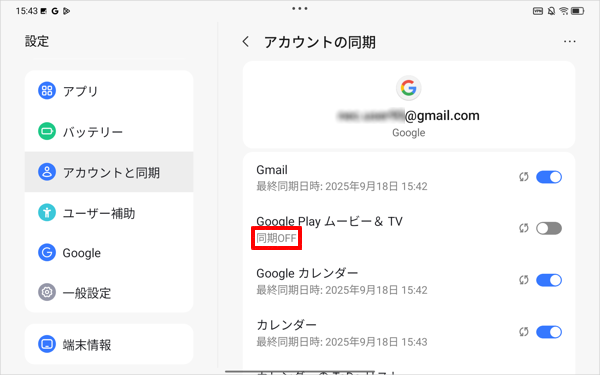 「オフ」にした項目名の下には「同期OFF」と表示されます。