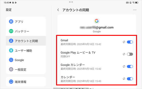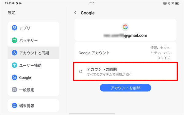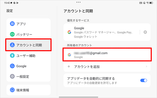 ここでは例として、Googleアカウントでの同期を有効または無効に設定する方法について案内します。ほかのアプリのアカウントの同期設定を変更する場合も、ほぼ同様の操作で設定することができます。