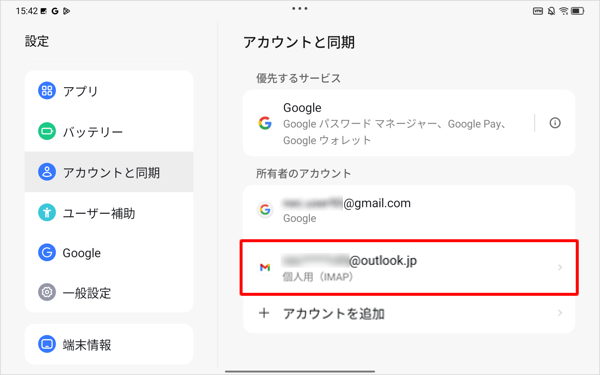 画面左側から「アカウントと同期」をタップし、表示された一覧から同期設定を変更したいアカウントの種類をタップします。