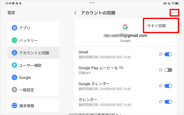 設定した同期内容を手動で最新の状態に更新したい場合は、画面右上の「」(その他のオプション)をタップし、「今すぐ同期」をタップします。
