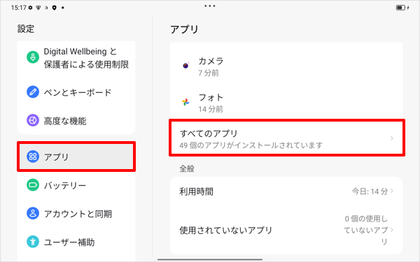 画面左側から「アプリ」をタップし、表示された一覧から「すべてのアプリ」をタップします。