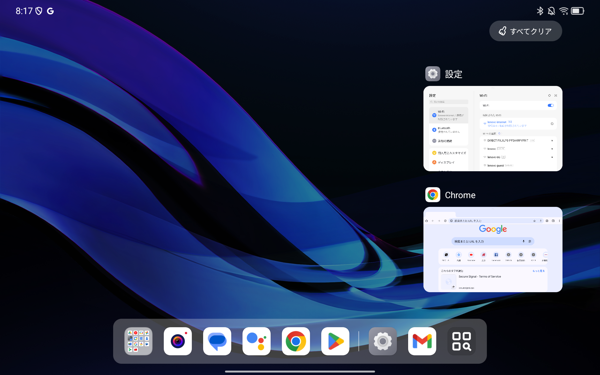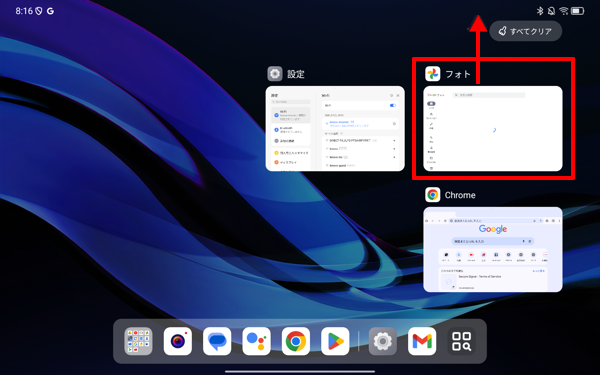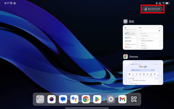 マルチタスク画面の右上に表示されている「すべてクリア」をタップすると、起動している複数のアプリを一括で終了することができます。