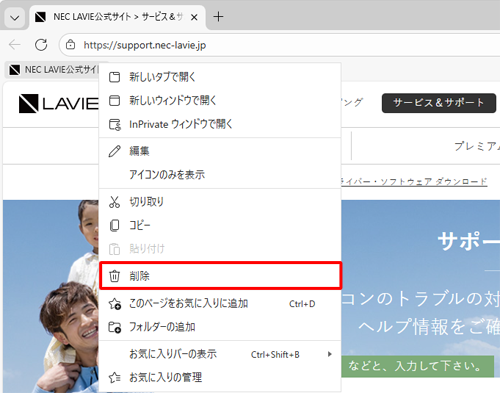 Q&A検索 製品 LAVIE Windows 11のMicrosoft Edgeでお気に入りに追加したWebページを削除する方法