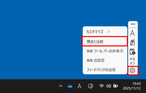 IMEツールバーを縦置きにするには、IMEツールバーの「」(設定)をクリックし、表示された一覧から「横または縦」をクリックします。