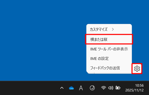 IMEツールバーの「」(設定)をクリックし、表示された一覧から「横または縦」をクリックします。