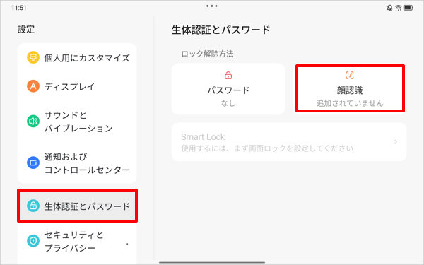 Q&A検索 製品 LAVIE Android LAVIE Tab T LAVIE Tab T11(2025年02月発表機種)の顔認証搭載機種で画面ロックを設定する方法