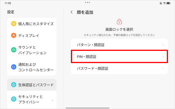 ここでは例として、「PIN・顔認証」をタップします。