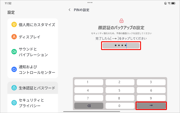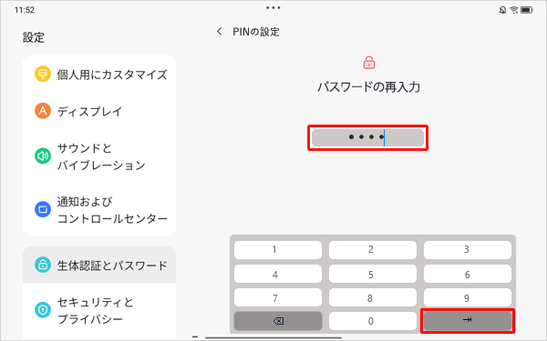 4桁以上の数字をPINとして設定し、「」をタップします。