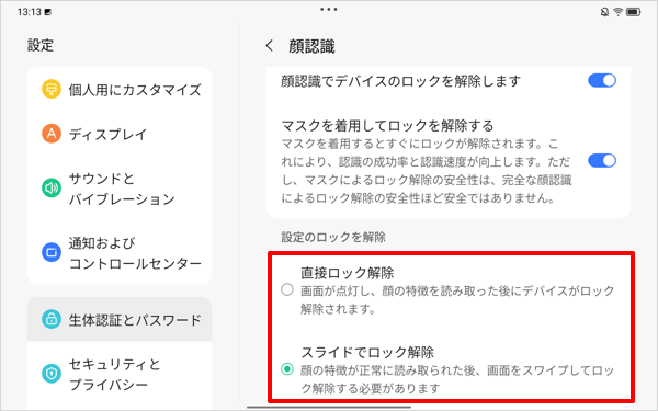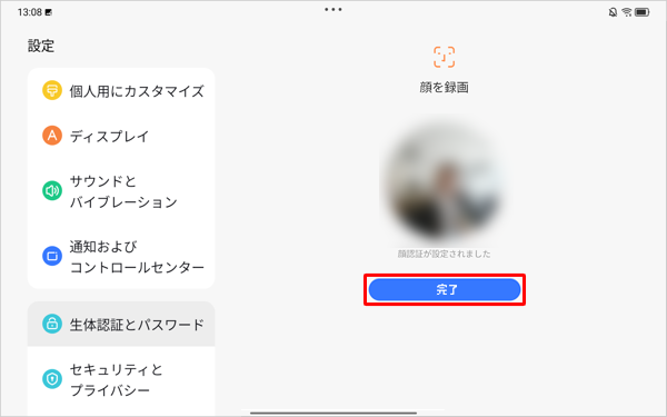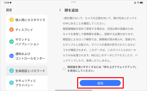※ 「顔認識を使いやすくするには…」にチェックを入れると、タブレットを持ち上げたときに顔認証が自動で起動するように設定することができます。