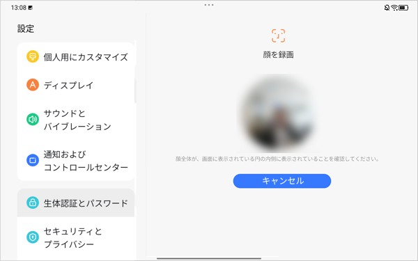 LAVIE Tab T11(2025年02月発表機種)の顔認証搭載機種で画面ロックを設定するには、以下の操作手順を行ってください。