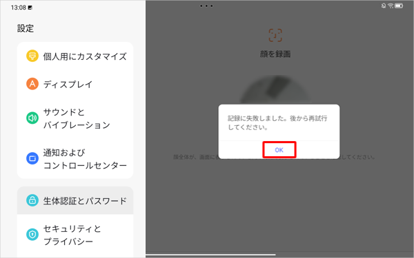 顔認証の登録に失敗すると、「記録に失敗しました。…」と表示されます。