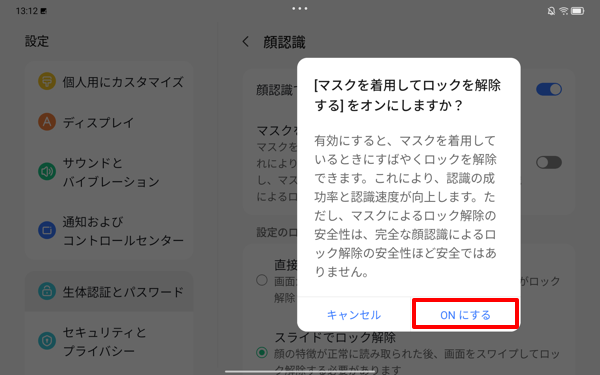 「[マスクを着用してロックを解除する]をオンにしますか?」が表示されます。