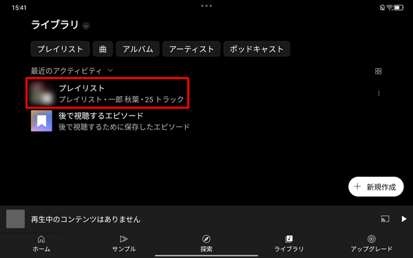 ライブラリでは、最近のアクティビティや自分専用のプレイリストなどが表示されます。