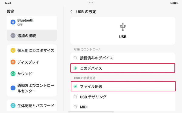 「USBのコントロール」欄で「このデバイス」が選択されていることを確認し、「USBの接続用途」欄から「ファイル転送」をタップします。